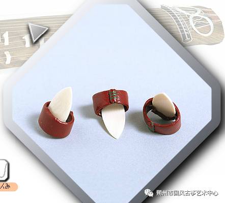 日本筝演奏用的义甲也不同与中国古筝:日本筝的义甲是三指,无名指不佩戴,材质也以树脂居多。生田流派和山田流派的又不尽相同,下图是山田流和生田流的义甲: